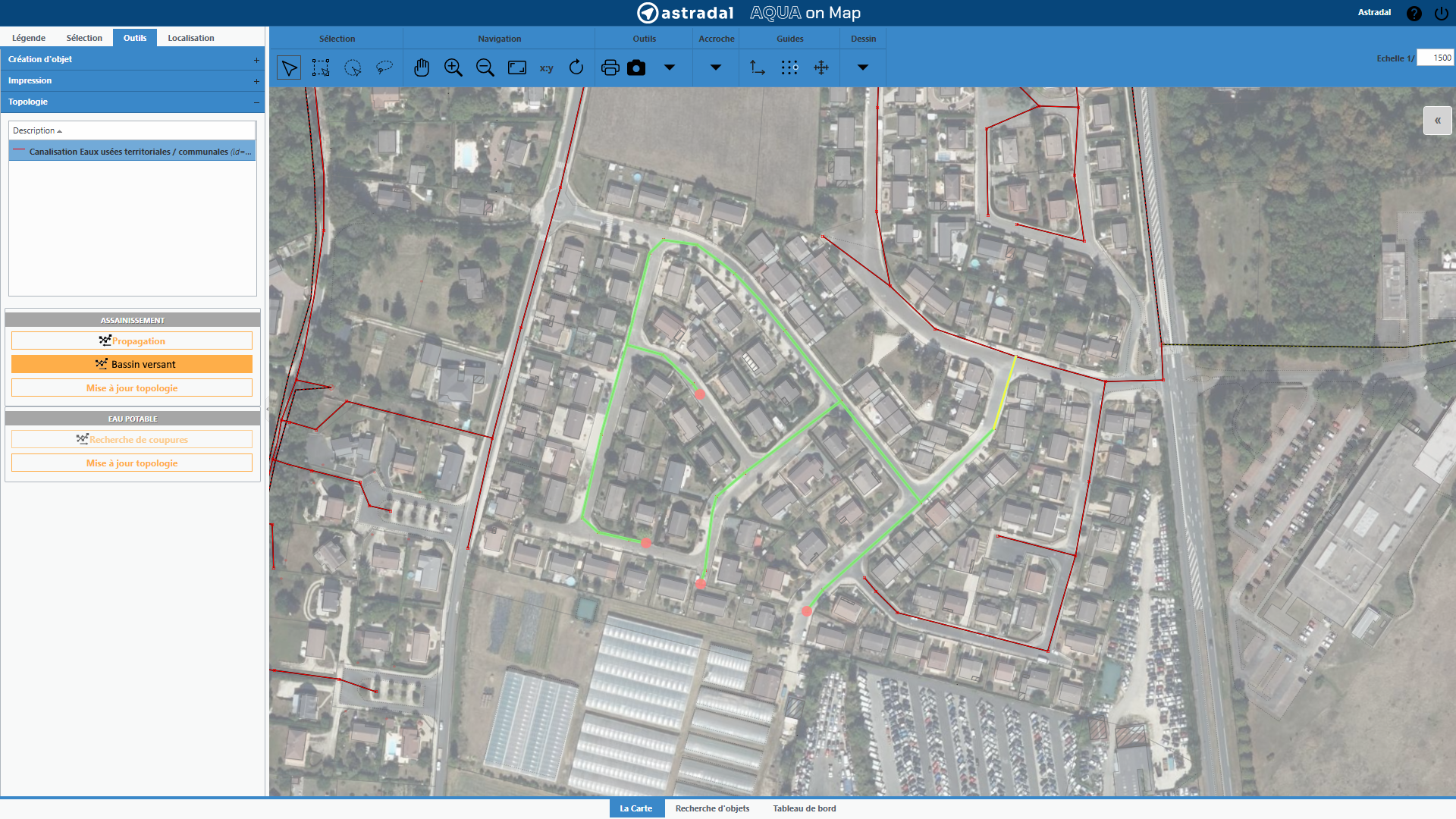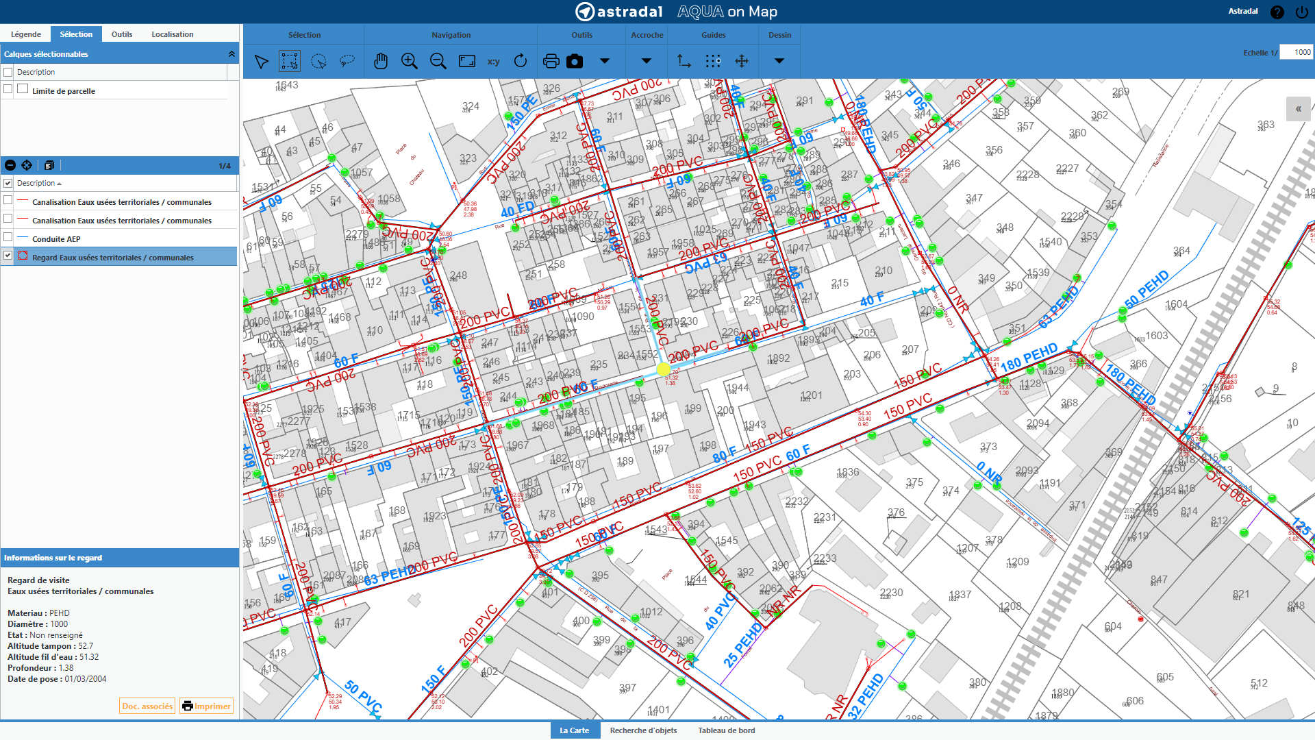 Notre solution Aqua on Map allie la cartographie de votre patrimoine à la gestion des caractéristiques de vos réseaux. Issu de plans de récolement, de relevé GPS ou directement saisis dans notre solution, l'ensemble de votre patrimoine réseau est représenté géographiquement par des styles et thématiques répondant à vos besoins.